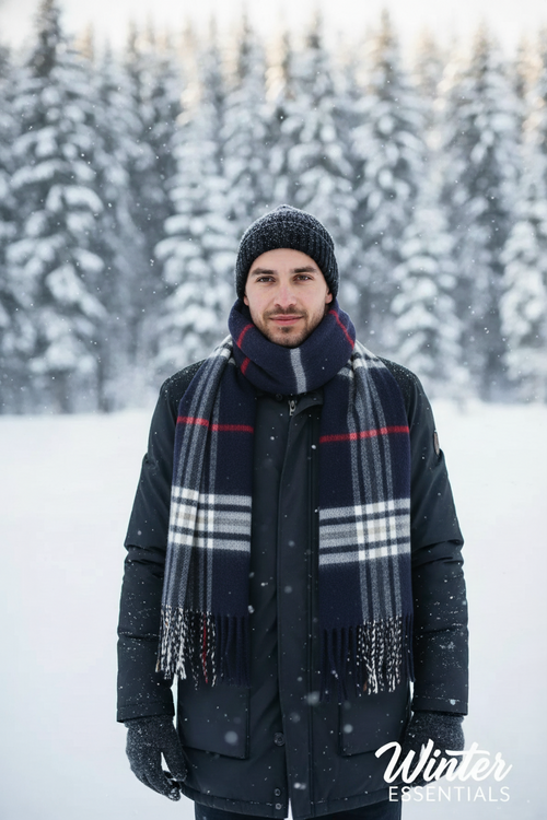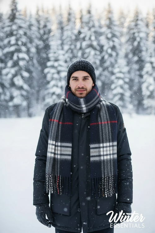 Wrap yourself in luxurious comfort with our Winter Essentials Premium Plaid Scarf in sophisticated navy blue. This isn't just any scarf—it's your cozy companion for the coldest winter days.